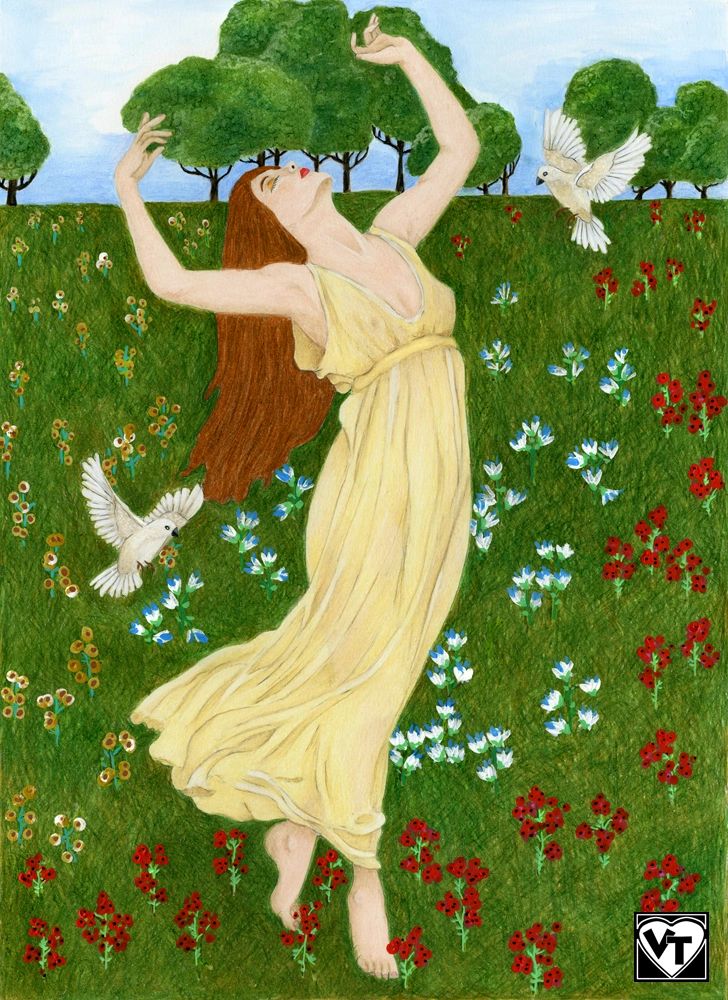 The subject of this drawing realizes her life is a miracle. She dances with the birds in the glorious warmth of the morning sun, smelling the flowers and feeling grateful.