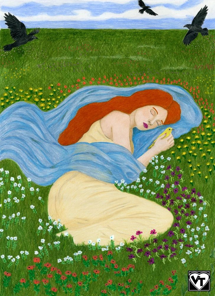 In this drawing, a woman is enveloped by a deep sleep, symbolized by a blue scarf that wraps around her. She dreams that she holds a yellow bird, the fragile part of herself, protecting it from the black ravens that fly above. She lies in a field of wildflowers below a blue sky, illustrating a wider world available to her if she can overcome her hesitations.